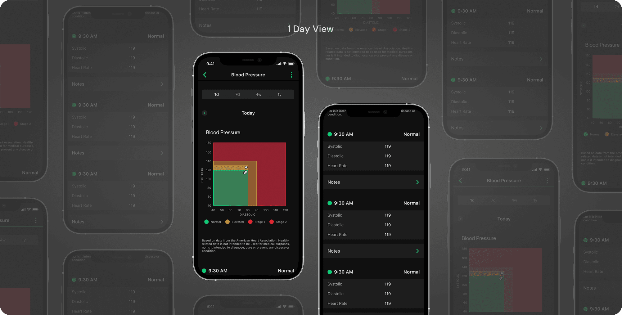 For the today view, I utilized a chart similar to what the AHA used to show the ranges of Normal, Elevated, Stage 1, Stage 2 and Hypertensive crisis in some cases. A dot would represent on an X and Y axis chart to show that day's readings.