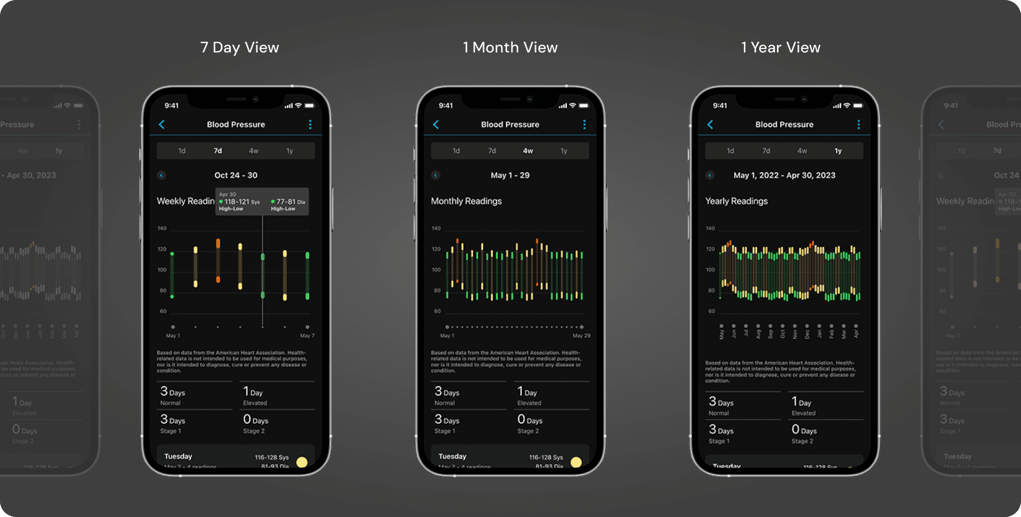 For past data we would display a line to show the systolic and diastolic ranges of readings. Along with list cards that could take you to a more detailed view of your data.
