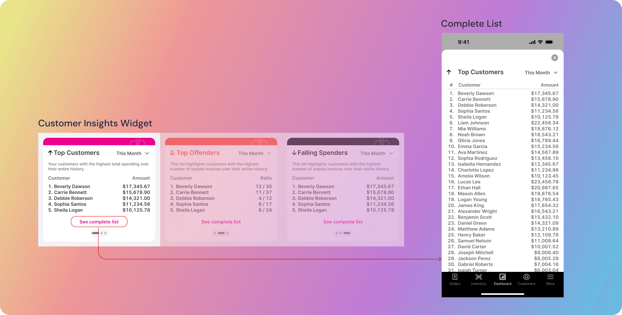 We created a new customer reports section. I wanted to surface insights that highlight top spending customers and regular customers that are starting to fall off in spending.