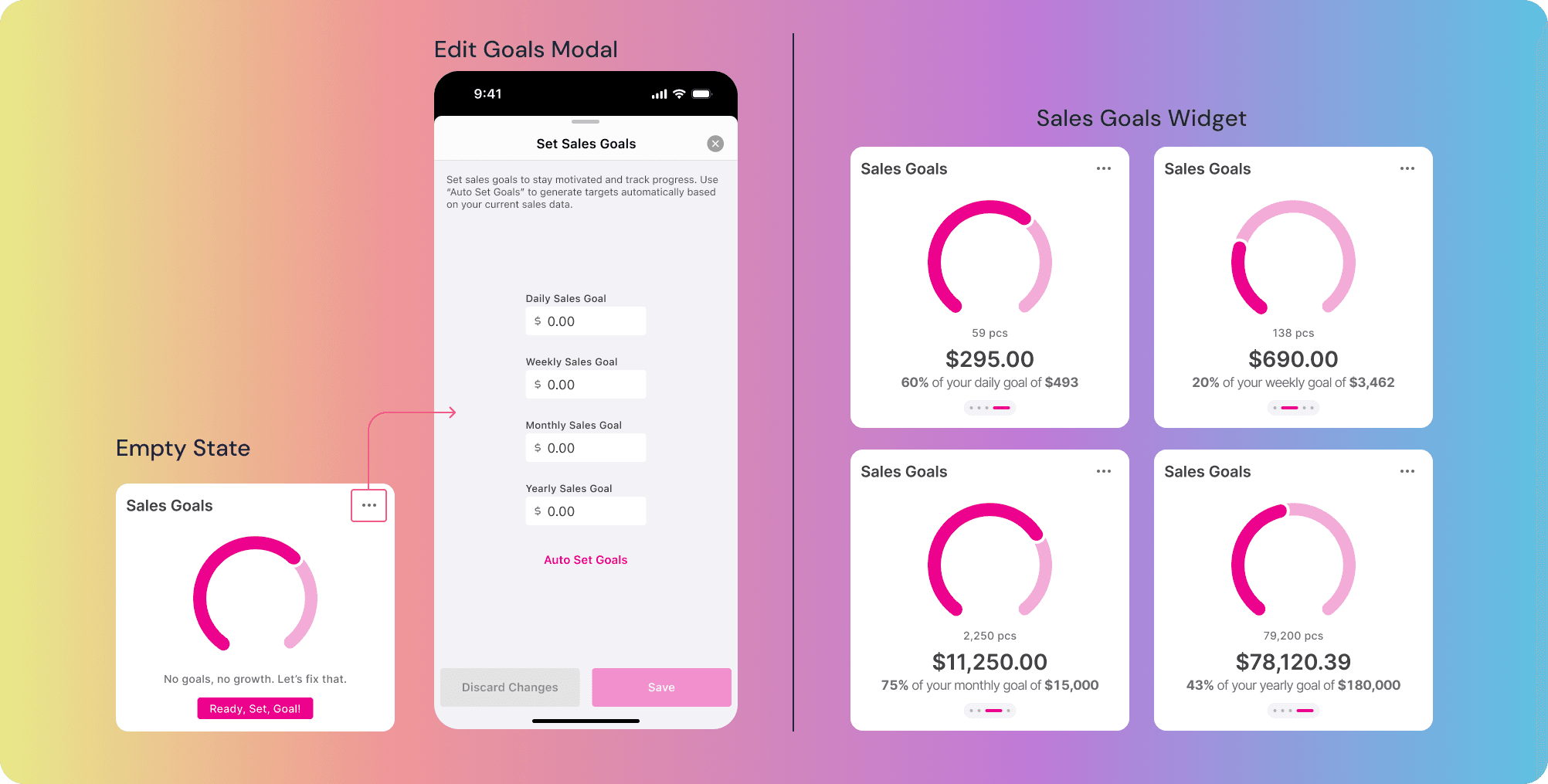 Setting sales goals or using the auto-goal feature gamifies retailers into hitting their sales goals improving revenue. The feature lays the groundwork for badges and leaderboards in the future.